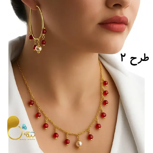 گردنبند خوشهای با جلوهای چشمگیر و گوشوارههای هماهنگ با آن، یک استایل کاملاً یلدایی، شیک و دخترانه برای شما میسازد.