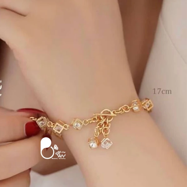 دستبند مکعبی کریستالی ، یک دستبند خاص و زیبا به رنگ طلایی که از مکعب های کریستالی زیبا ساخته شده است.