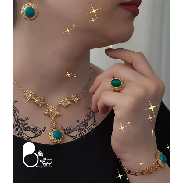 توضیحات: سرویس کامل ستاره ای کپی طلا رنگ ثابت با طراحی خاص و ترندی، شامل انگشتر طرح رندمی اما کاملاً ست با سرویس. موجود در دو رنگ عقیق و فیروزهای، عرضه با تخفیف ویژه.