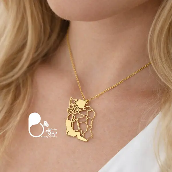 توضیحاتگردنبند ایران من با برش ظریف استان ها؛ نقشه ایران طلایی با دریاهای طلایی، خاص و هویت‌دار.