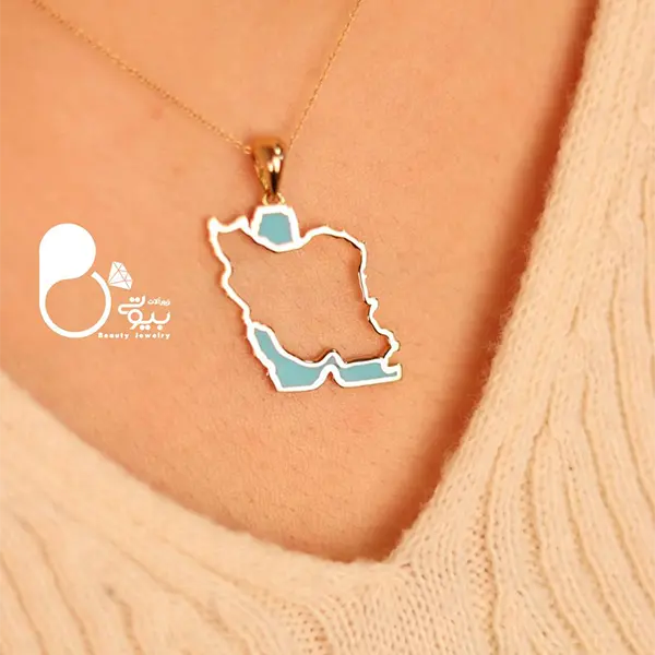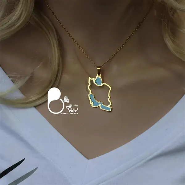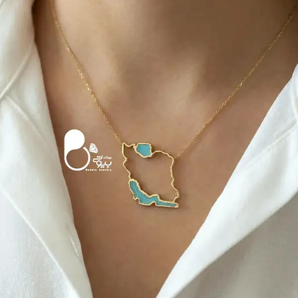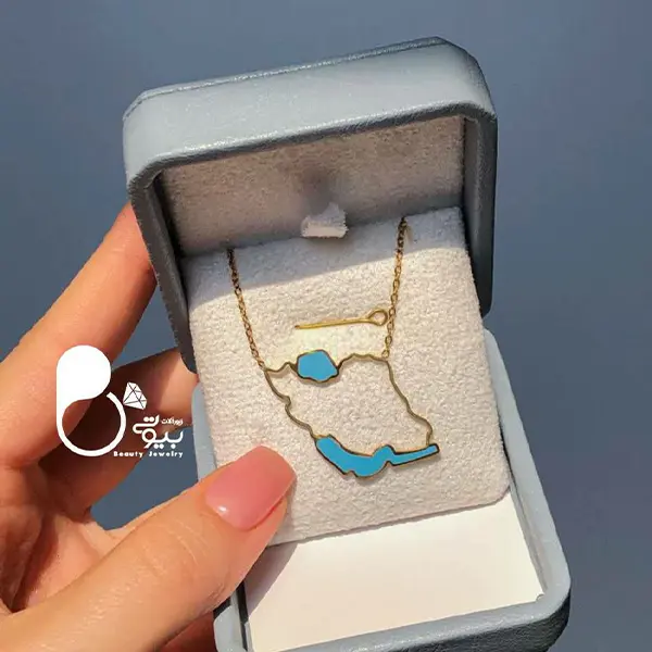 پلاک این گردنبند، نقشه کامل ایران را به رنگ طلایی نشان میدهد که دریای خزر و خلیج فارس با میناکاری آبی بهزیبایی از بدنه جدا شدهاند؛ ترکیبی هنرمندانه از رنگ، معنا و ظرافت.