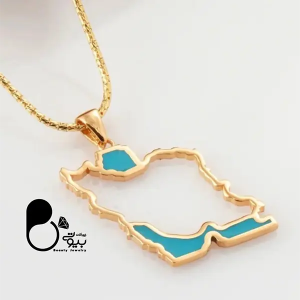 توضیحات: گردنبند ایران من ۲؛ نقشه ایران طلایی با دریاهای آبی، خاص و هویتدار.