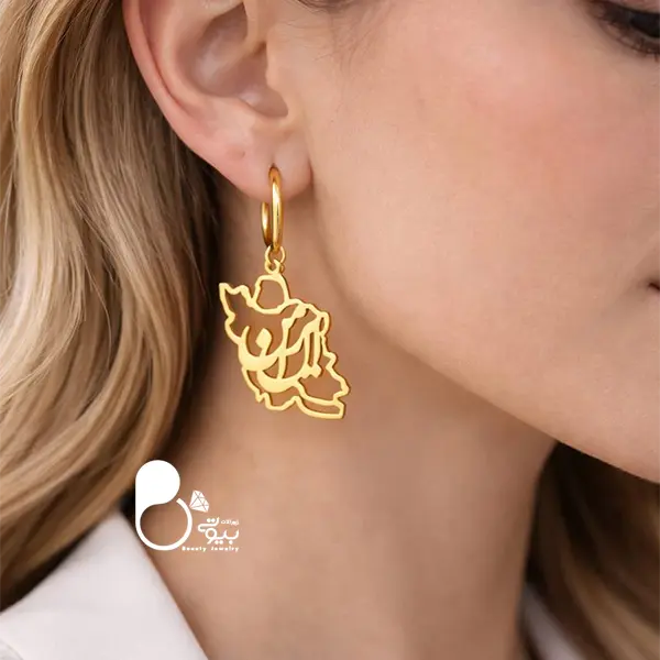 این گوشواره وطنی، نقشه کامل ایران با متن عاشقانه “ایران من” به رنگ طلایی است.